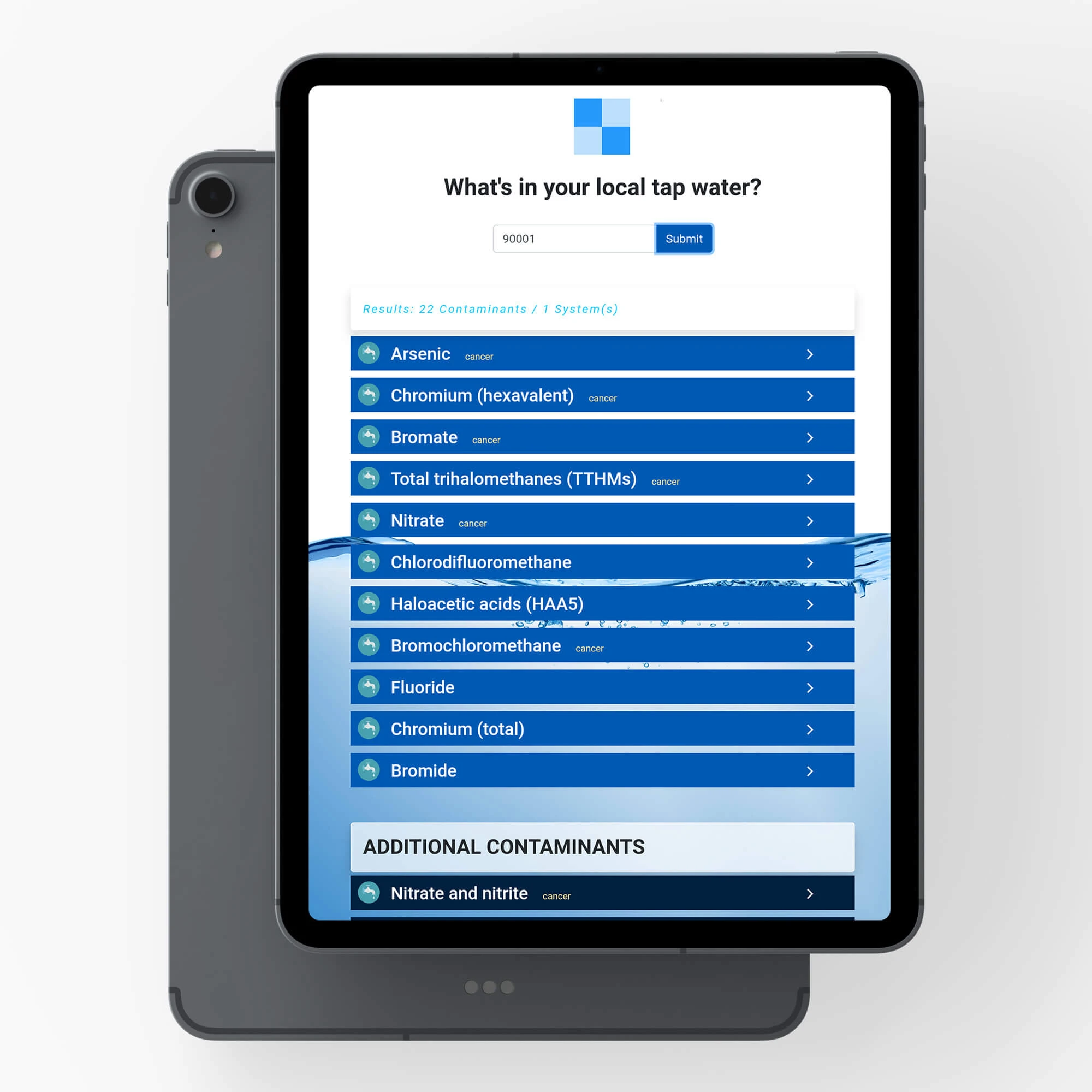 API Integration.: 2x list of contaminates are returned, for the customer’s location, displaying which ones can be filtered out by the filtration system and another list of contaminants that are also present in their drinking water.