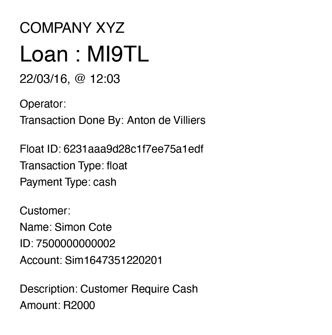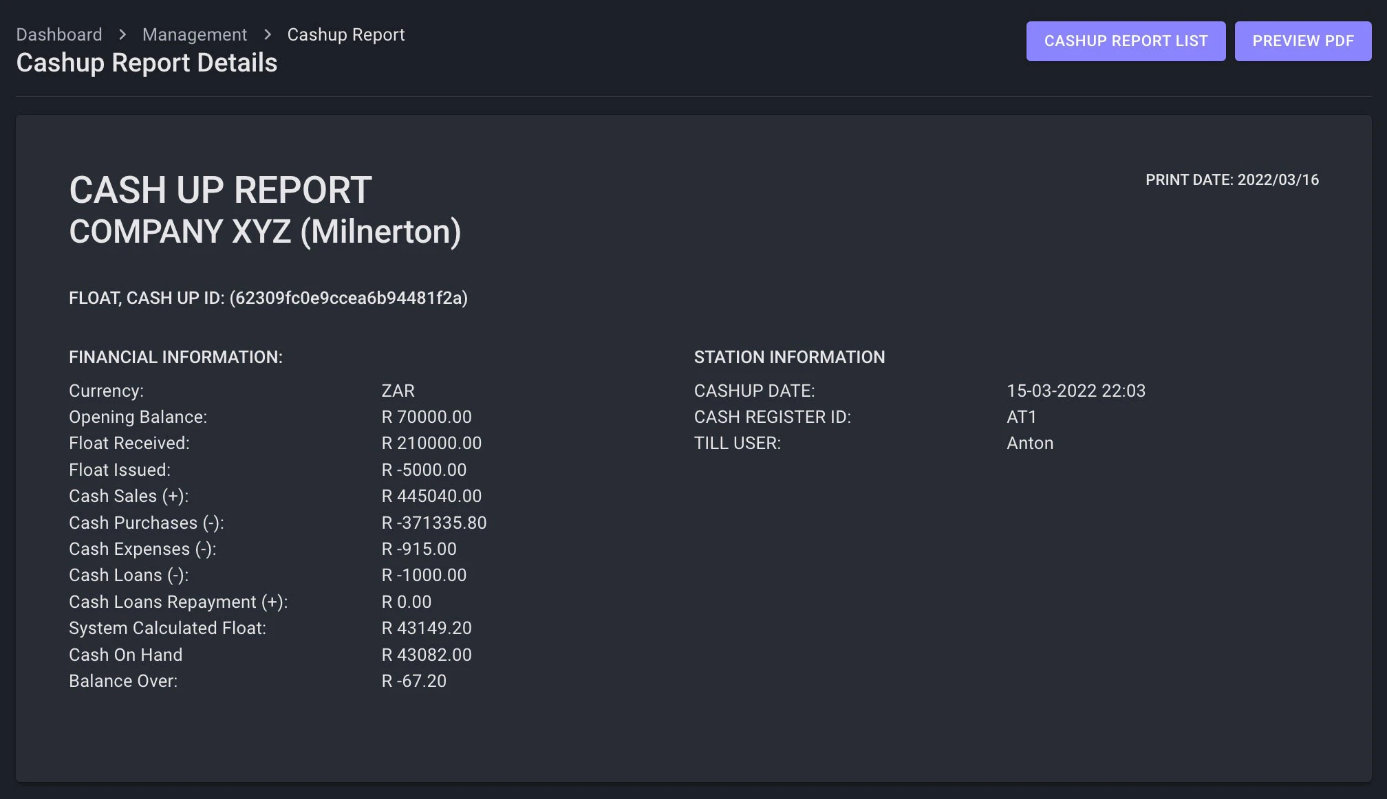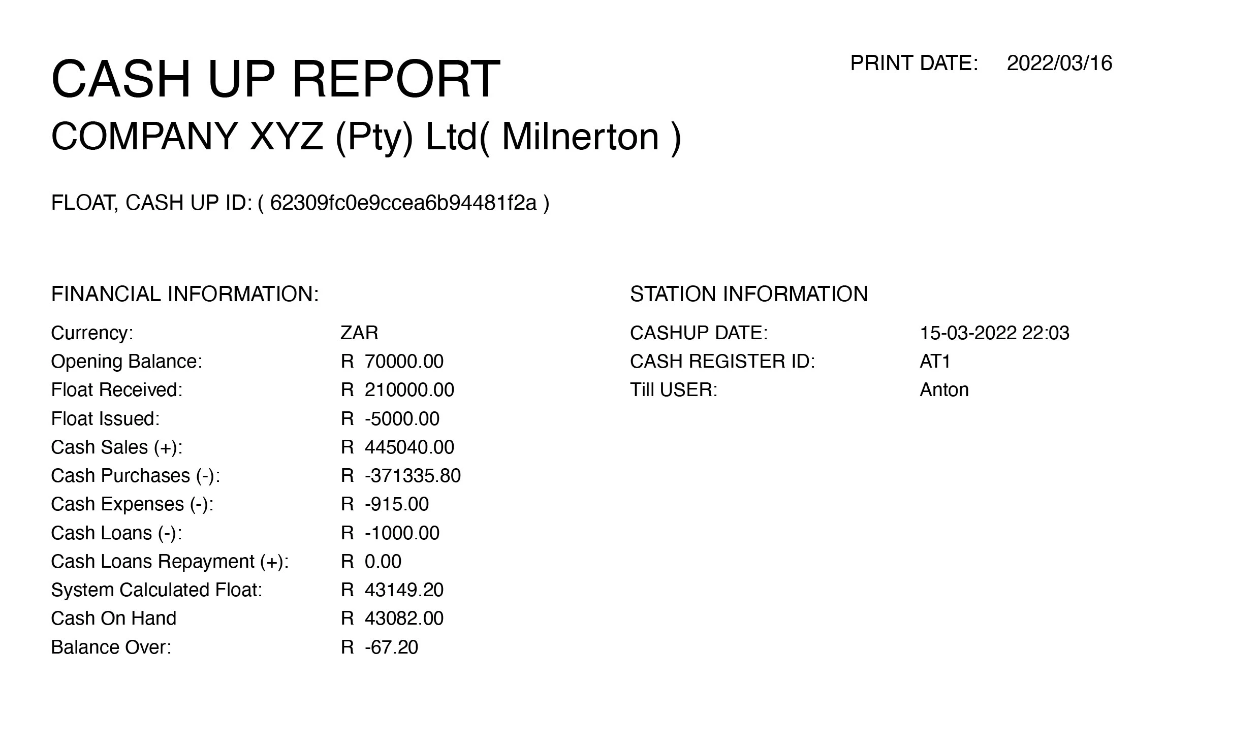- Cashup: Ability to perform a counted cashup in that each currency type is counted and then matched to the system float. Any discrepancies is indicated in a breakdown report called a Cashup Report giving a break down of the day's transactions.