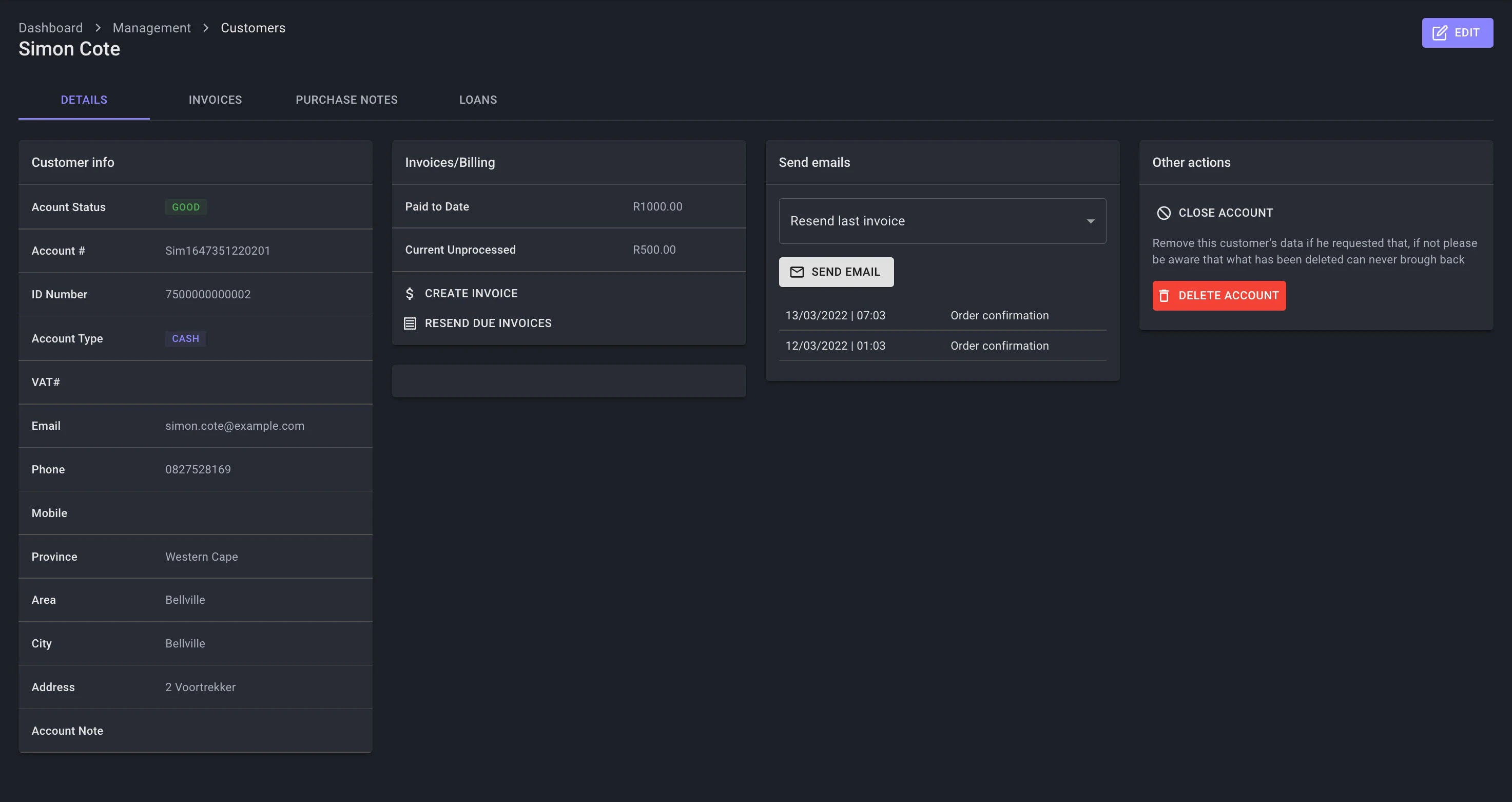 - Create, Edit, Update or Disable a customer. When a customer is disabled, its disabled from customer searches and the ability to add a customer to an order or perform and transactions. The disabled customer will still be searchable via the customer dashboard list only. A customer can never really be deleted, because that customer could be linked to a Weighbridge, Purchase or Sale. This is important for autdit tracking and order history.