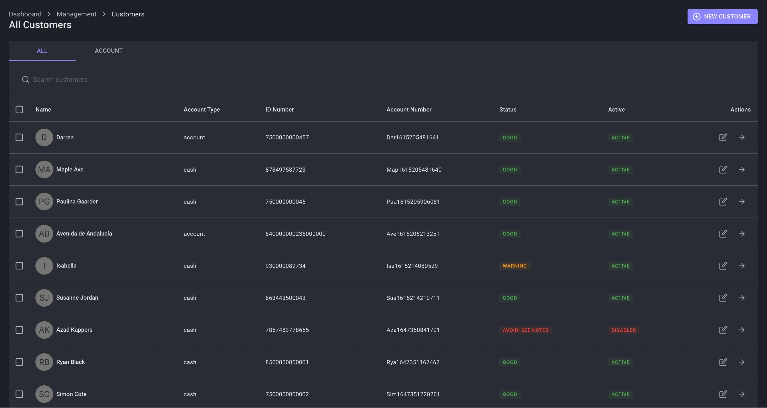 - Customers can also be search on Full Name, ID, Account Number or Vehicle Registration Number. This search feature is also avaialbe for all dashboards that interact with customers.