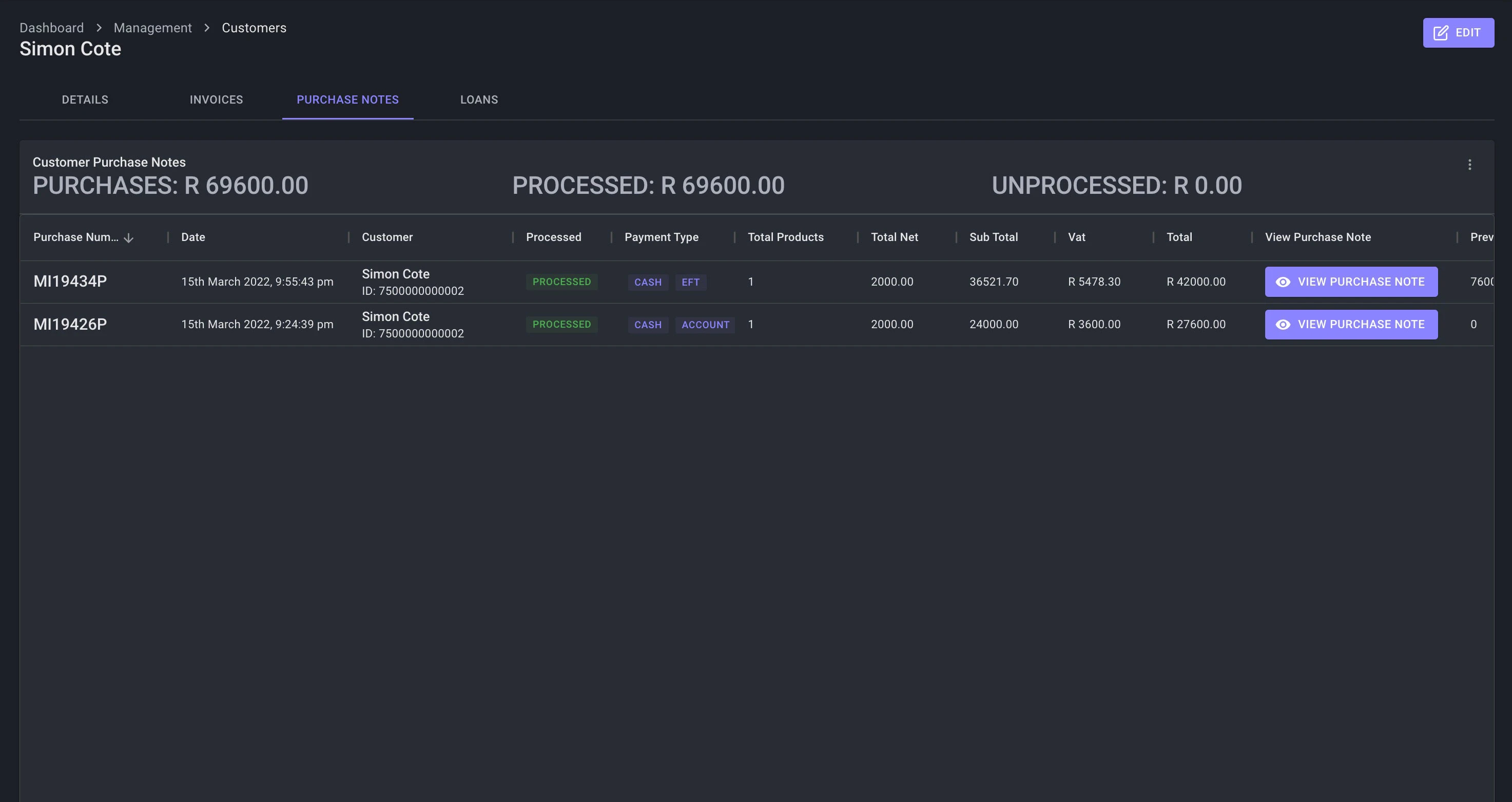 - Cust. Purchase Note List View
