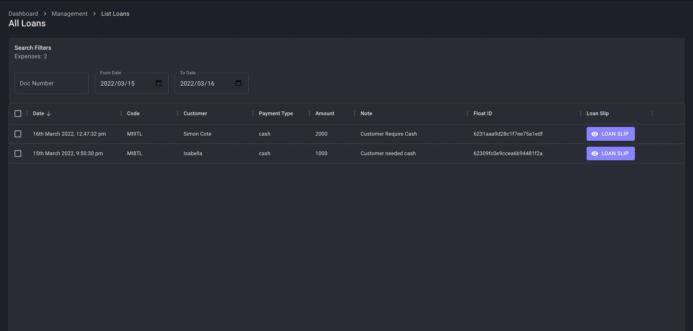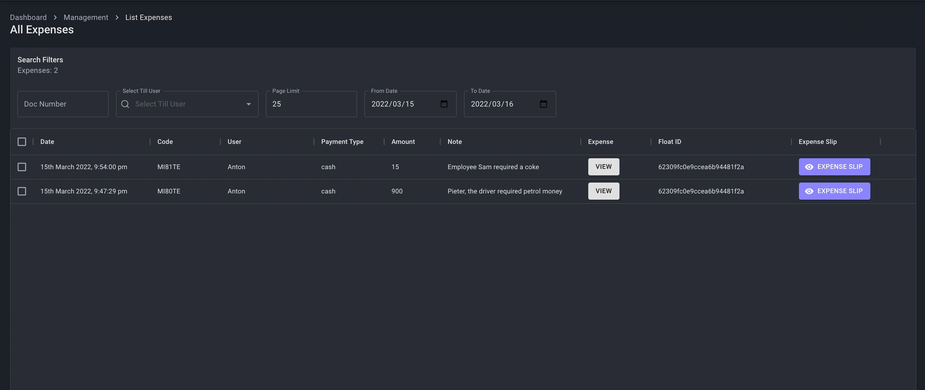 - Expenses have its own dashboard to view a filterable list of all expenses. Expense slips can be reprinted from here.