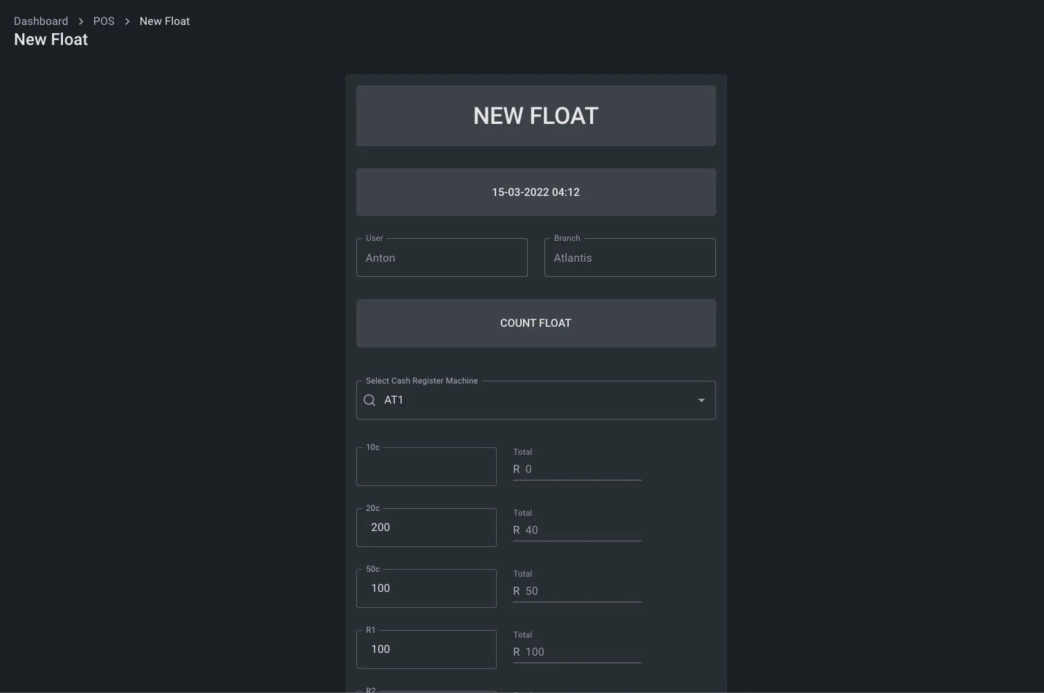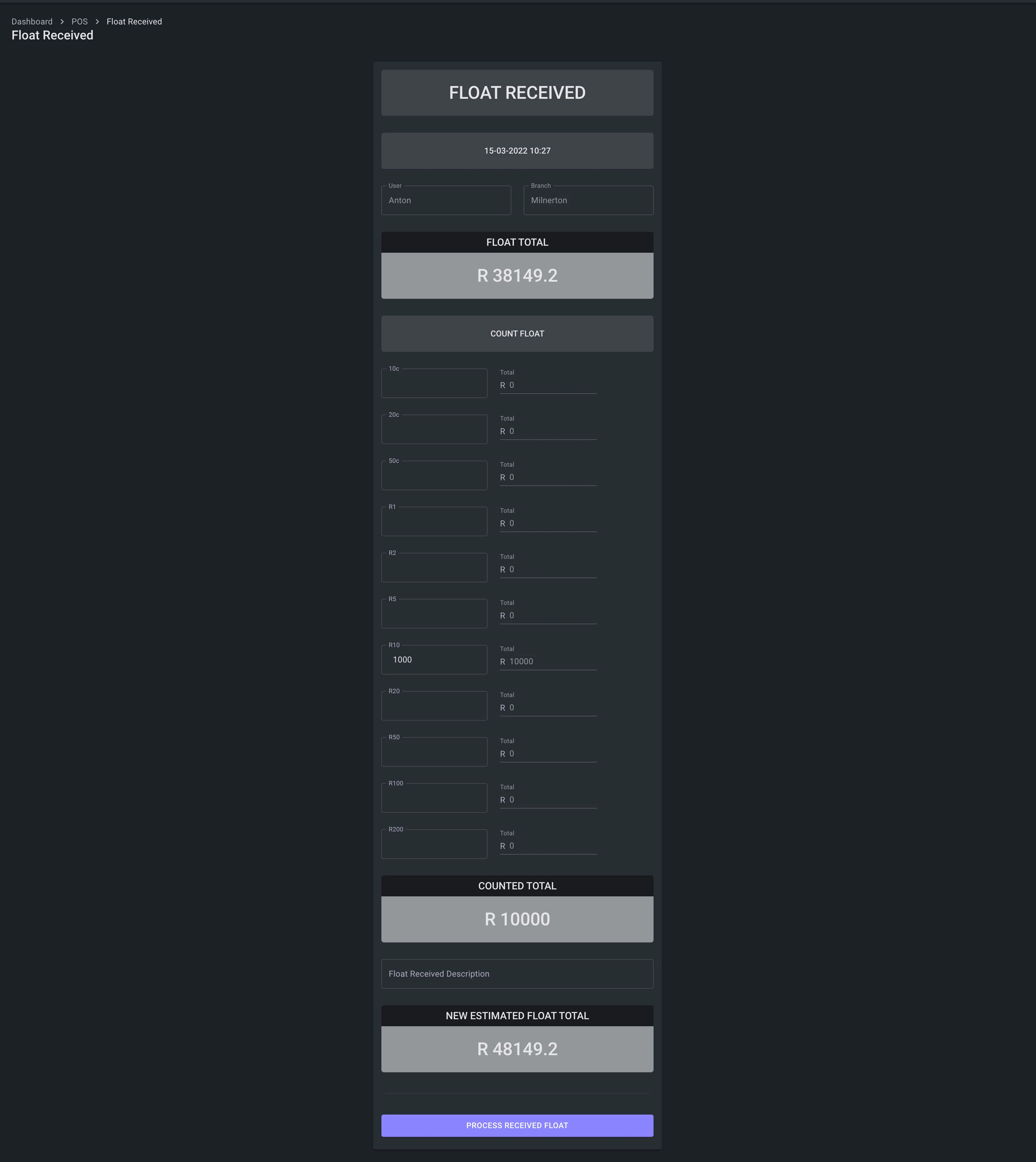 - New float: The till user is presented with a screen to enter the counted amount of each currency item. The system will then caluclate the value of the counted amount. For example if a 100x R100 is counted it will have a value of R1000. Al the currency values will be added together to generate the total float for the day.