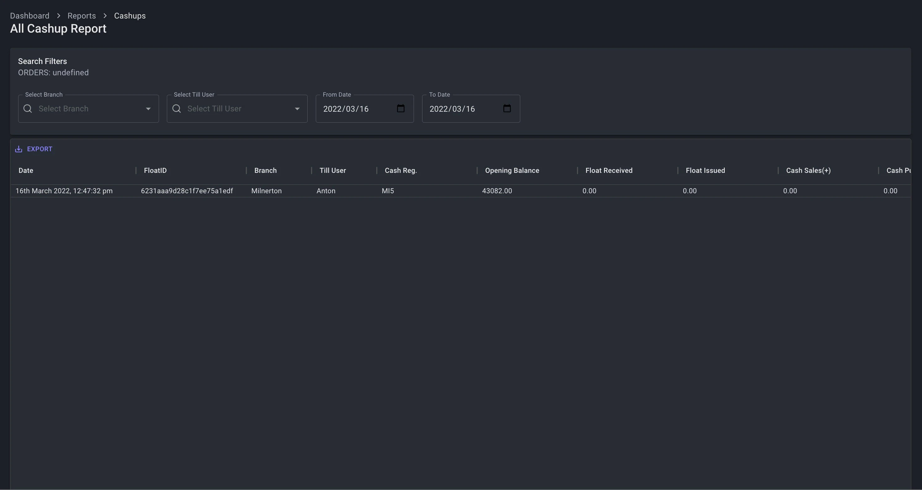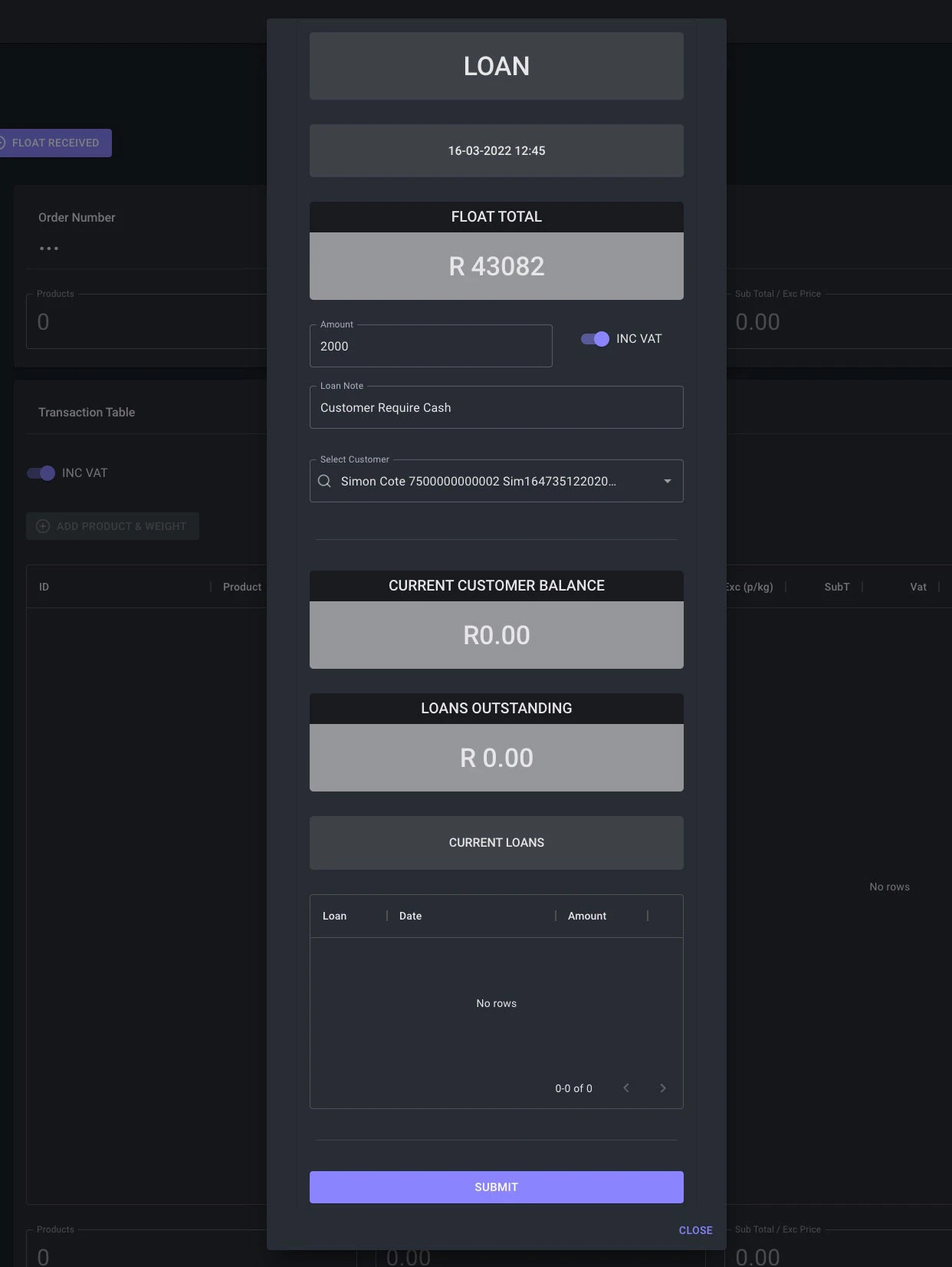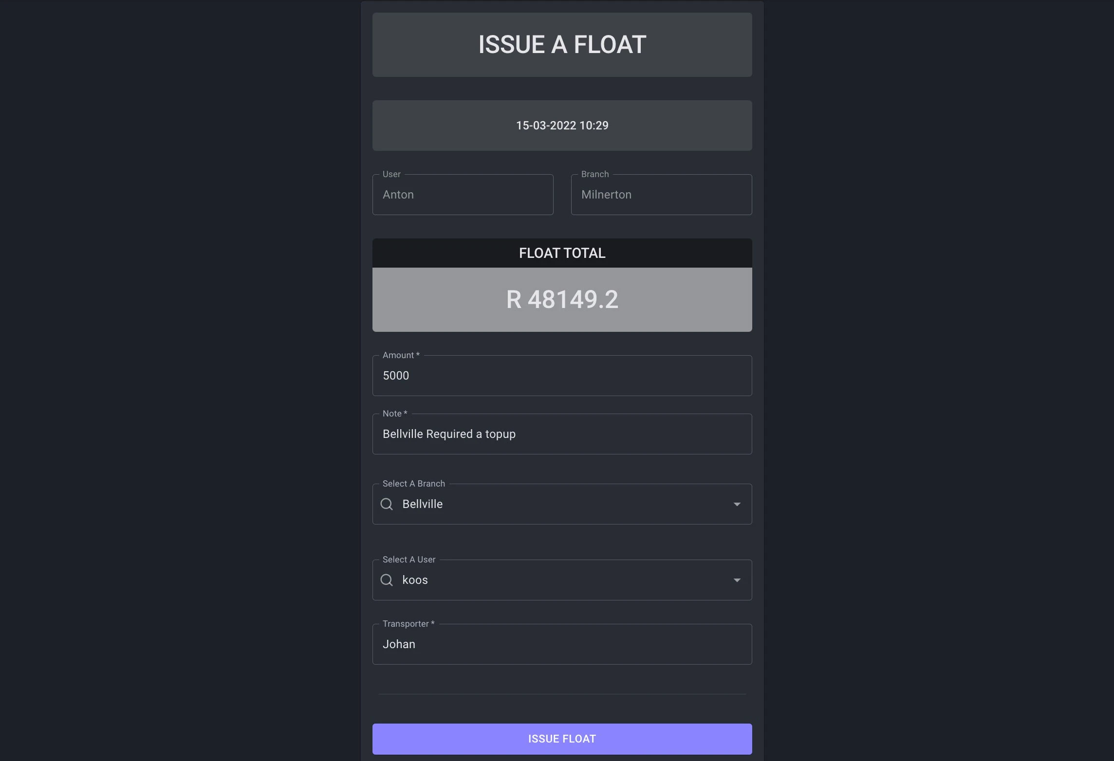 - Current Float Dashboard: This dashboard will showcase all current live float transaction for the day for the spesific user.