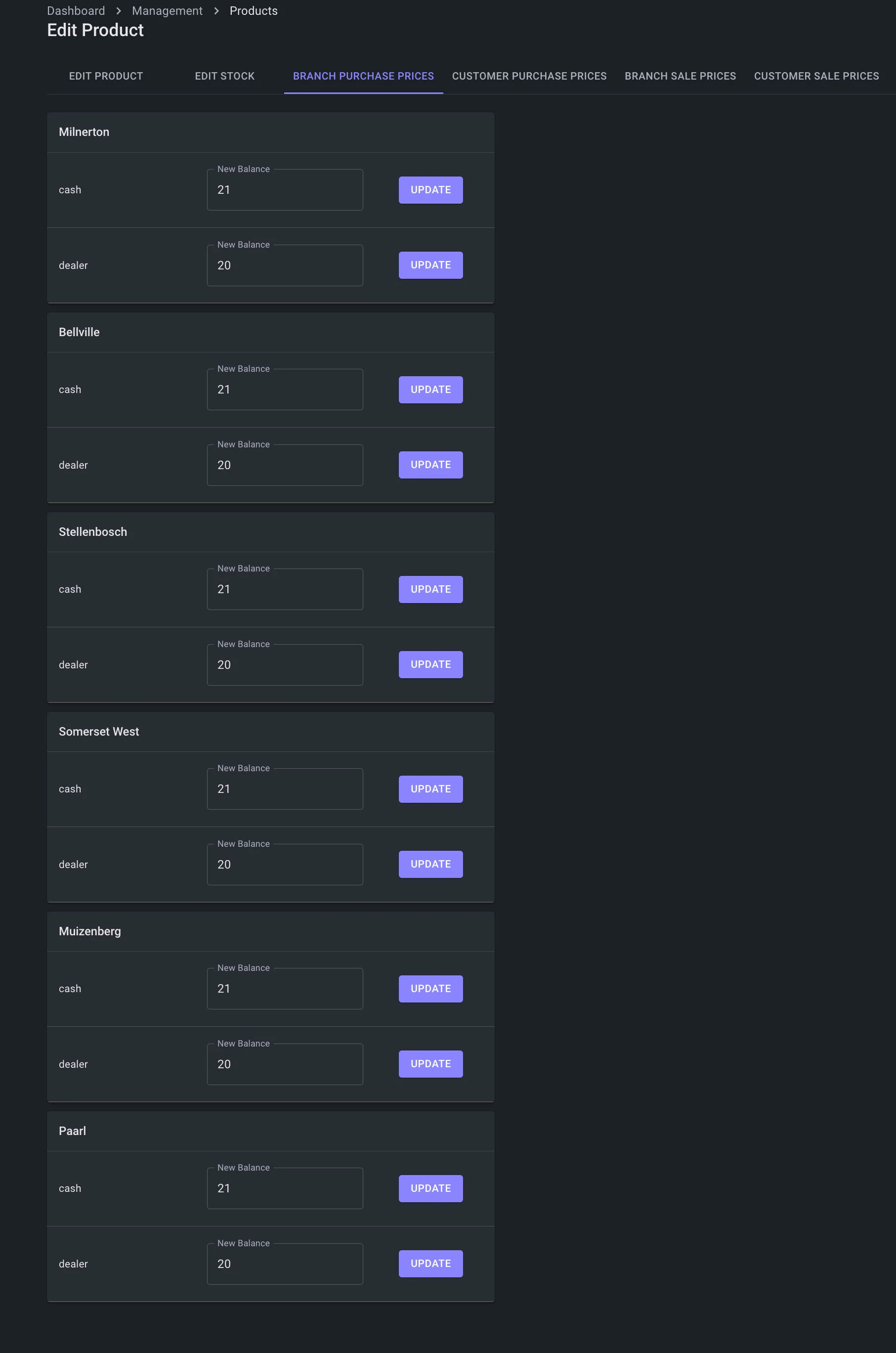 - Each Product have the option to add individual Purchase and Sale price types. This included Cash & Dealer prices for a branch and account prices for customers. This is to seperate diffirent prices for diffirent type of customers.