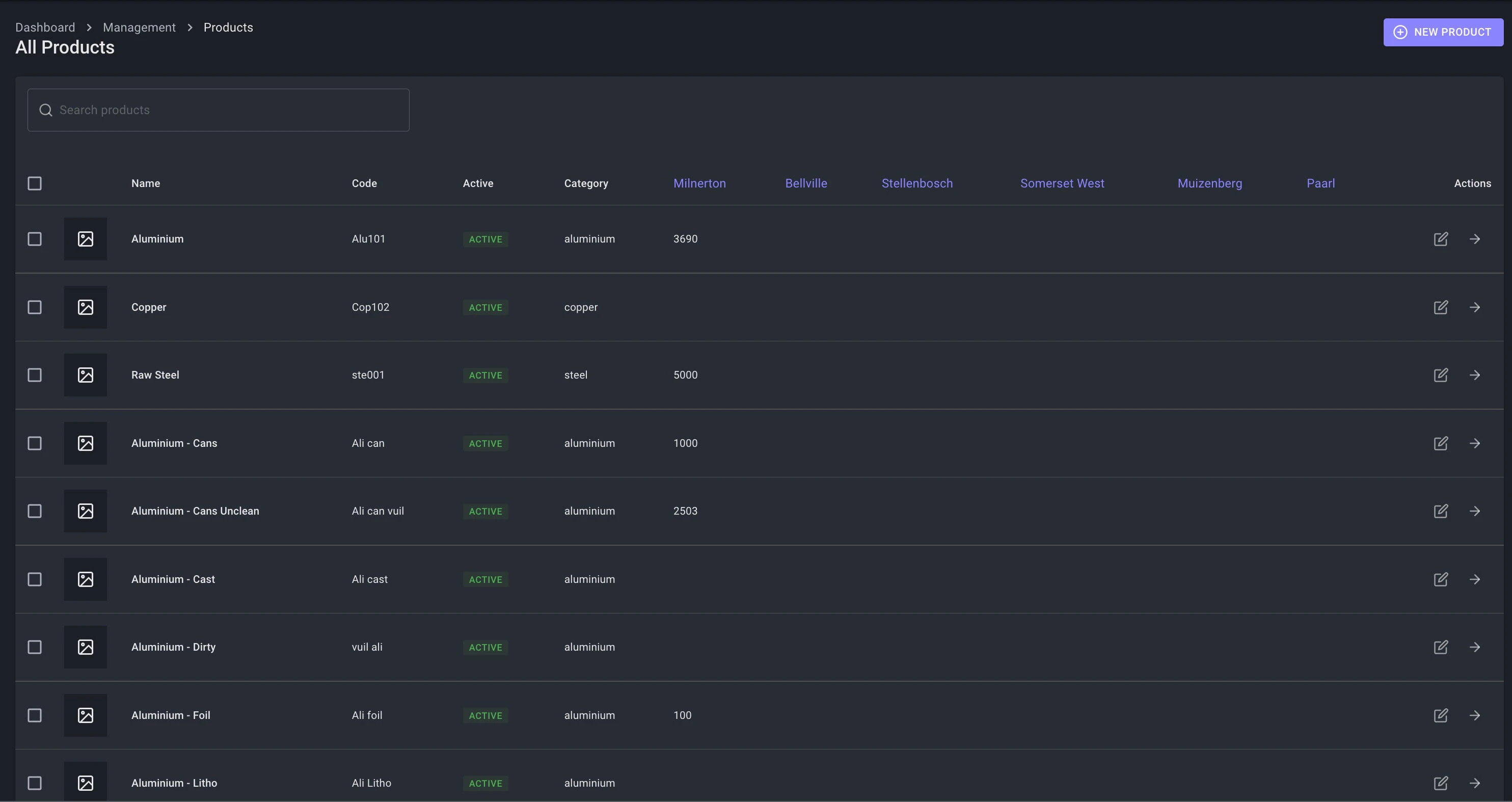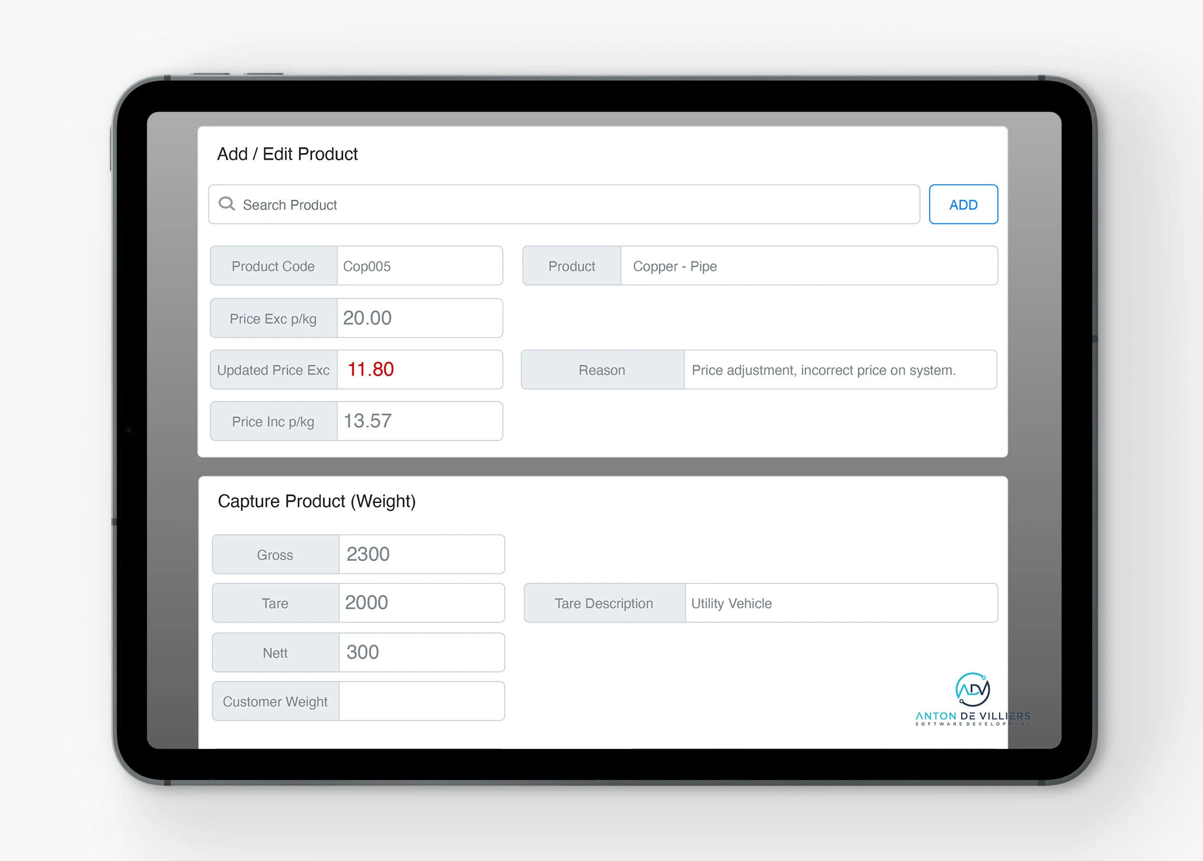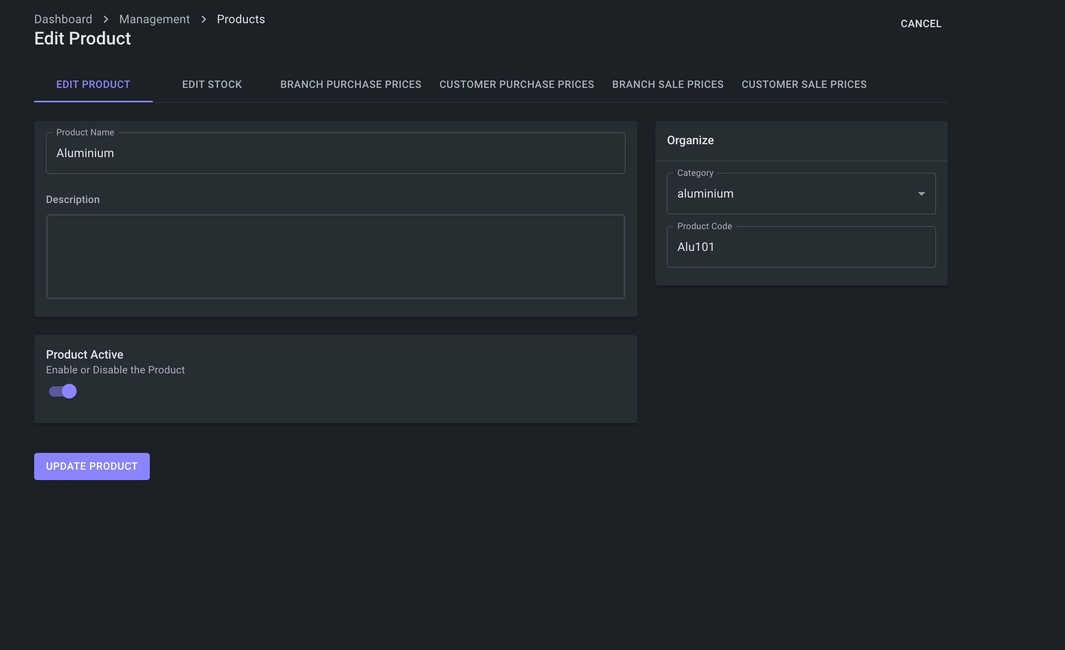 - Create, Edit, Update or Disable a product. A product can never really be deleted, because that product could be tied to a Weighbridge, Purchase or Sale. This is important for autdit tracking and order history.