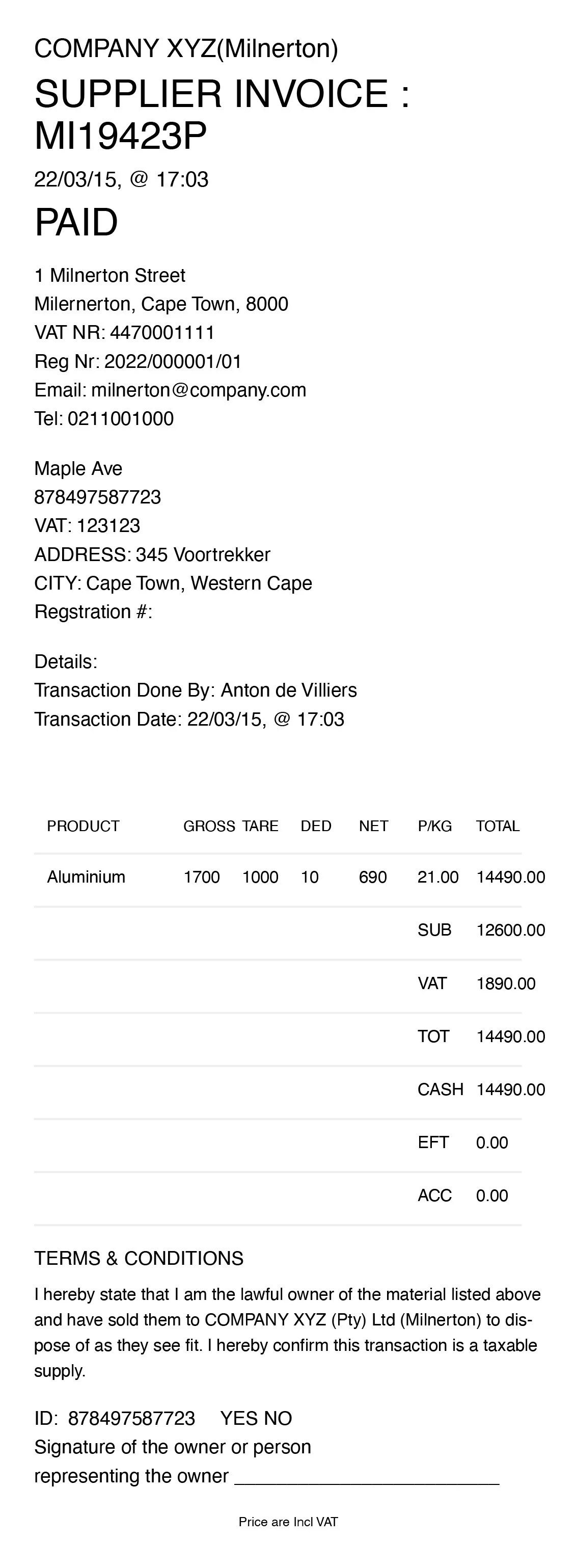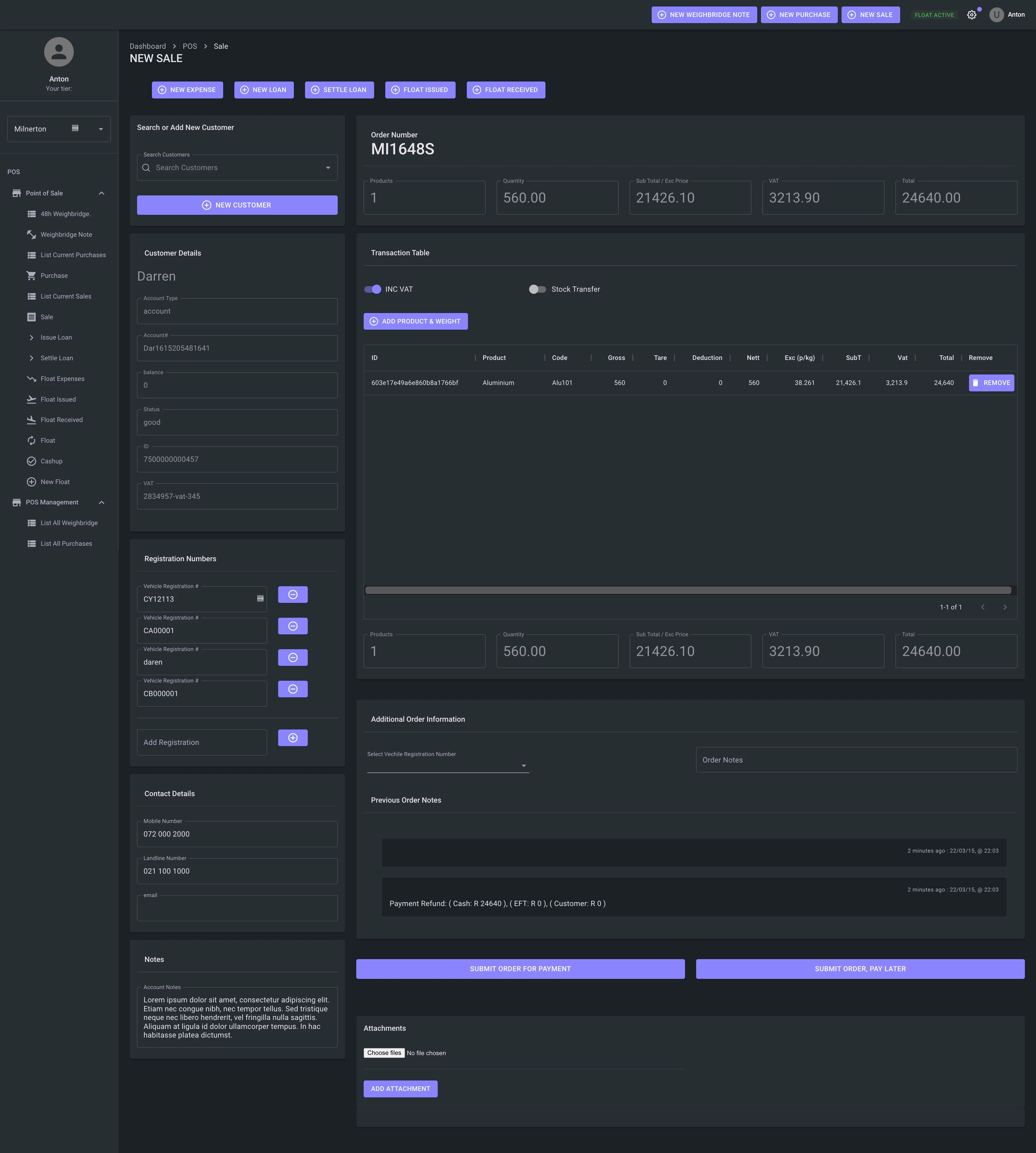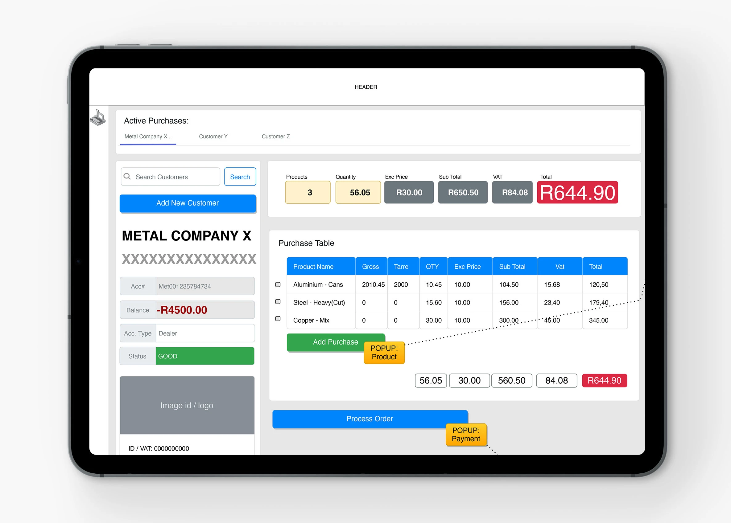 To facilitate efficient Point of Sale transactions for the sale of scrap metal to customers, the platform provides a comprehensive dashboard. This dashboard enables businesses to create or search for customers, display customer details, create and display Purchase Orders with editable line items, and receive payments via cash, EFT, or account.