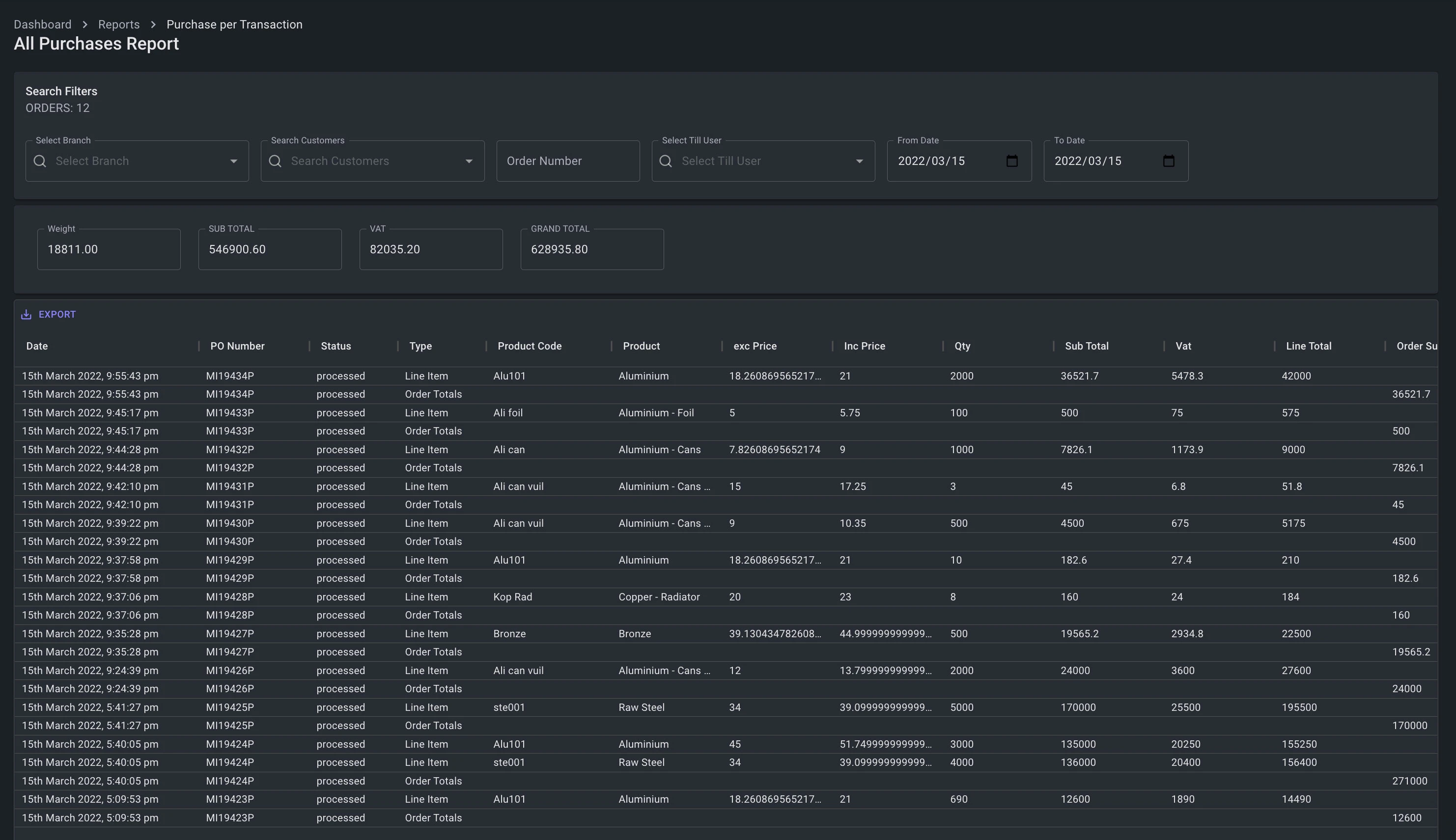 To facilitate efficient Point of Sale transactions for the acquisition of scrap metal from customers, the platform provides a comprehensive dashboard. This dashboard enables businesses to create or search for customers, display customer details, create and display Purchase Orders with editable line items, and process payments via cash, EFT, or account.