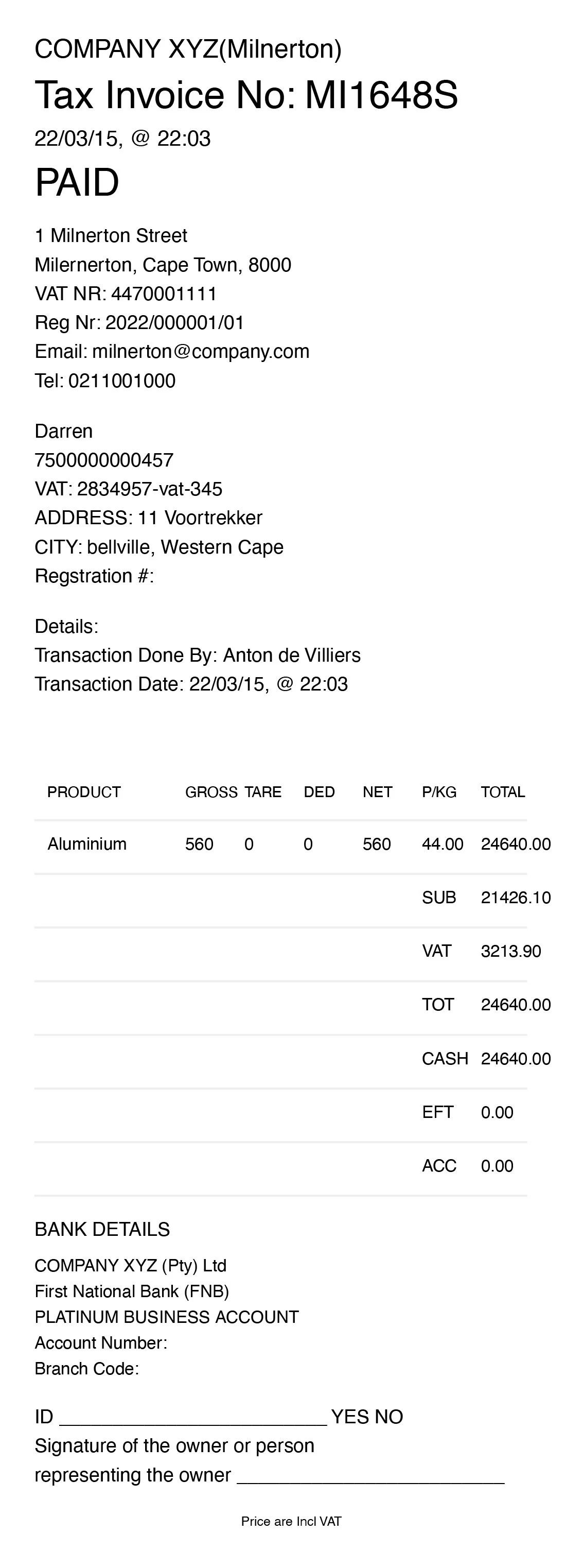 - Every line item, can be updates with Gross, Tare and Deduction values, if its not automatic populated coming from a Weighbridge note. Then the system will work out the Nett, the subtotal, the vat and the final inclusive total for that line item.