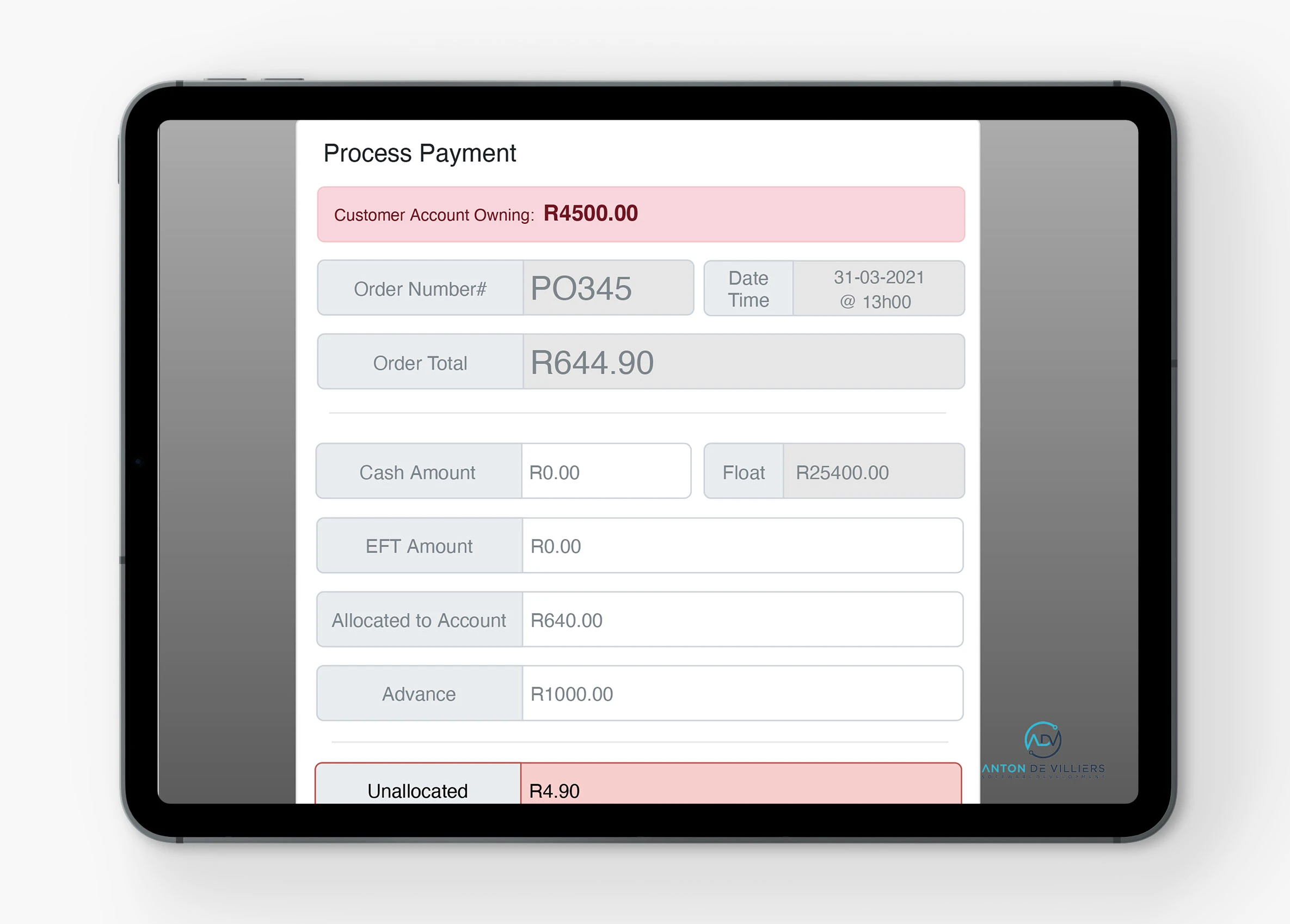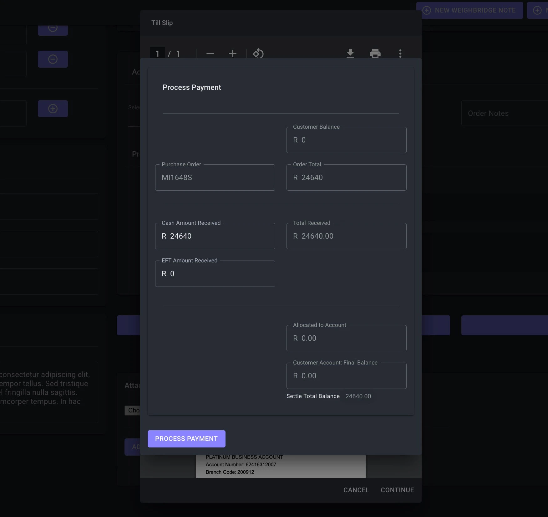- Payment Screen: Payments can be done via Cash, EFT or Account. If no physical money payments is performed the amount will be assigned to the customer account.