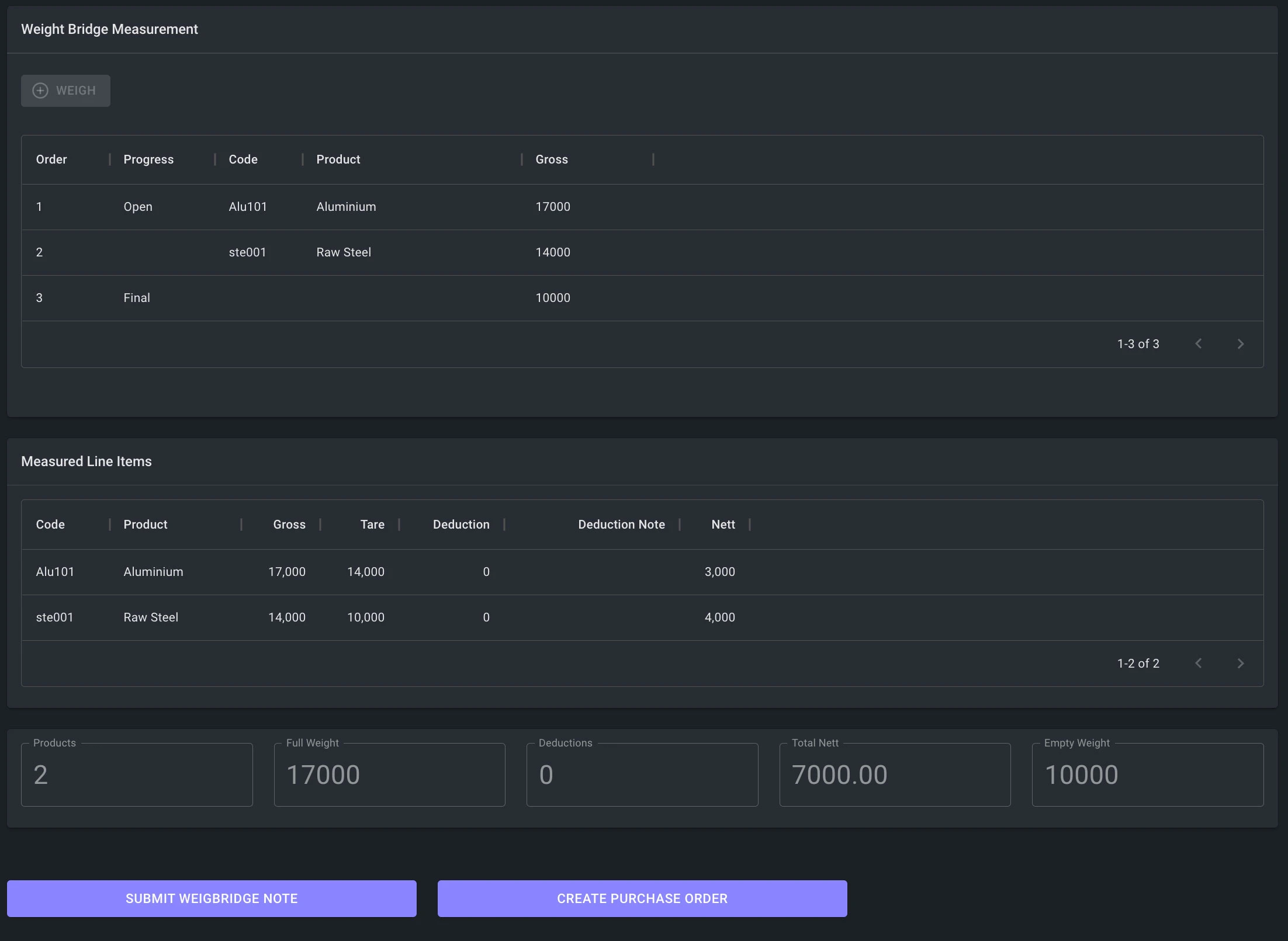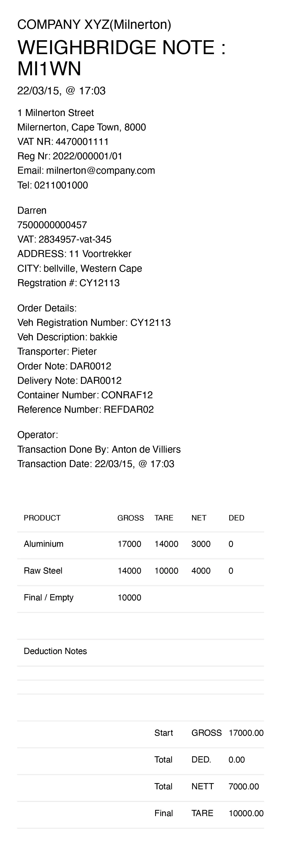 - Each weighted item is capture into a line item with its Product Code, Product Description, Gross, Tare, Deduction, Deduction Note and Nett value.